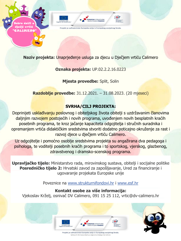 - Prezentacija projekta "Unaprjeđenje usluga za djecu u Dječjem vrtiću Calimero" - preuzmi PDF